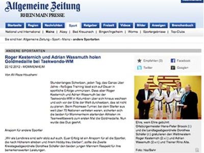 In der Online Ausgabe der "Allgemeinen Zeitung" ist anlässlich der offiziellen Ehrung der Weltmeister Roger Kesternich und Adrian Wassmuth in unserer ...