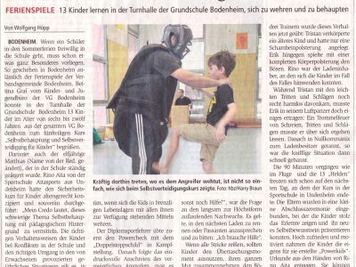 Während der Ferienspiele lernen Kinder in der Turnhalle der Bodenheimer Grundschule sich zu wehren und zu behaupten. Lesen Sie den vollen Artikel inde...